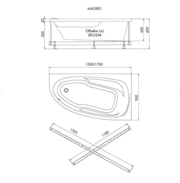 Акриловая ванна 1ACReal Мадрид Щ0000045645 левая обрезанная 170x95 см белый купить