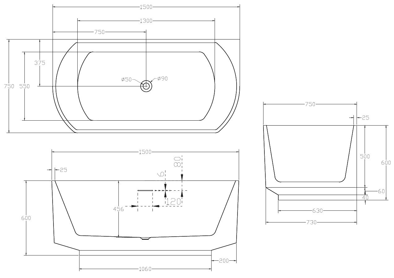 Акриловая ванна ABBER 150x75см AB9488-1.5