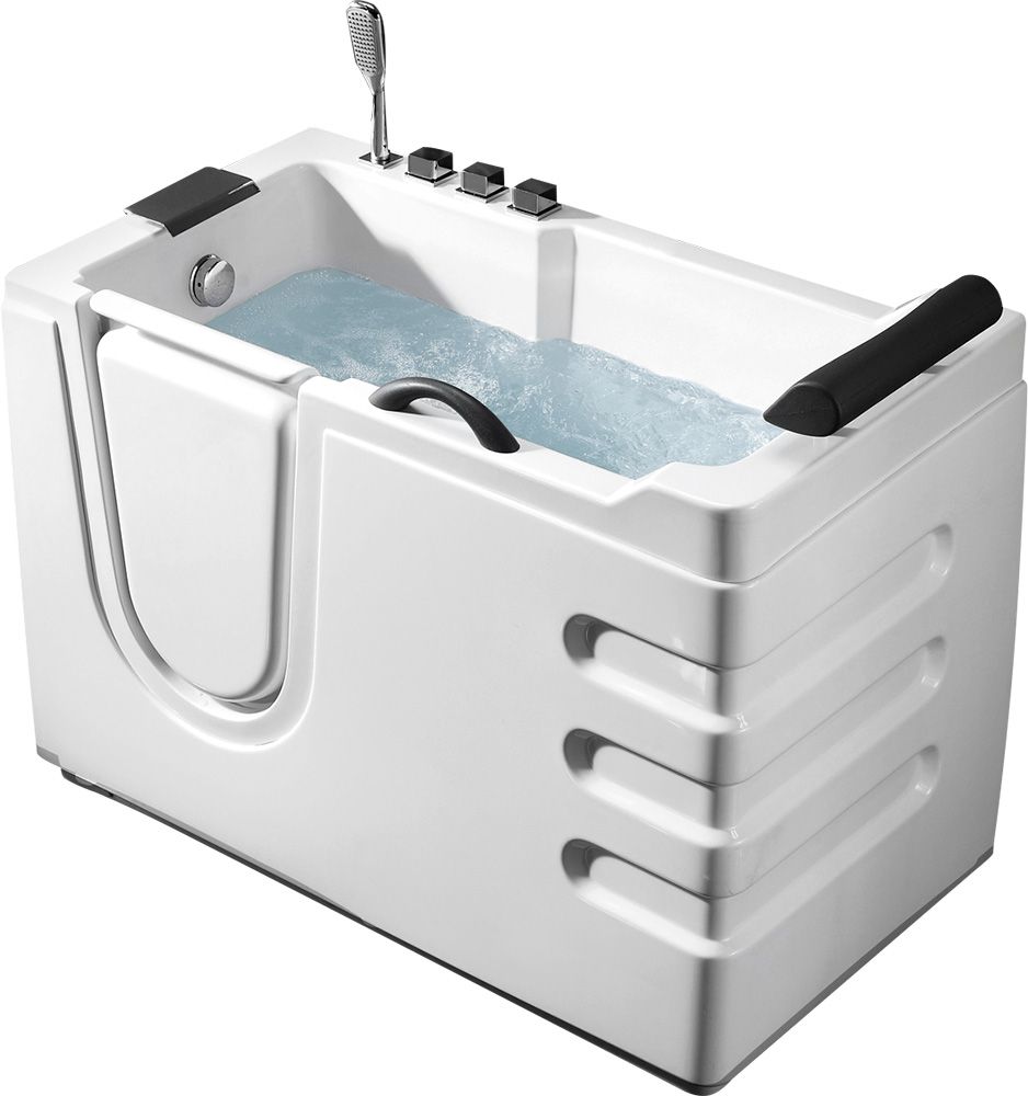 Главная особенность ванны — 100% герметичная дверь на петлях с надежным замком, которая позволяет легко входить и выходить, а невысокий порог входа (всего 28 см) значительно упрощает использование. Глубина ванны 71 см и объем 250 литров создают простор для расслабления, не вызывая дискомфорта.