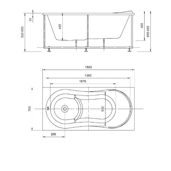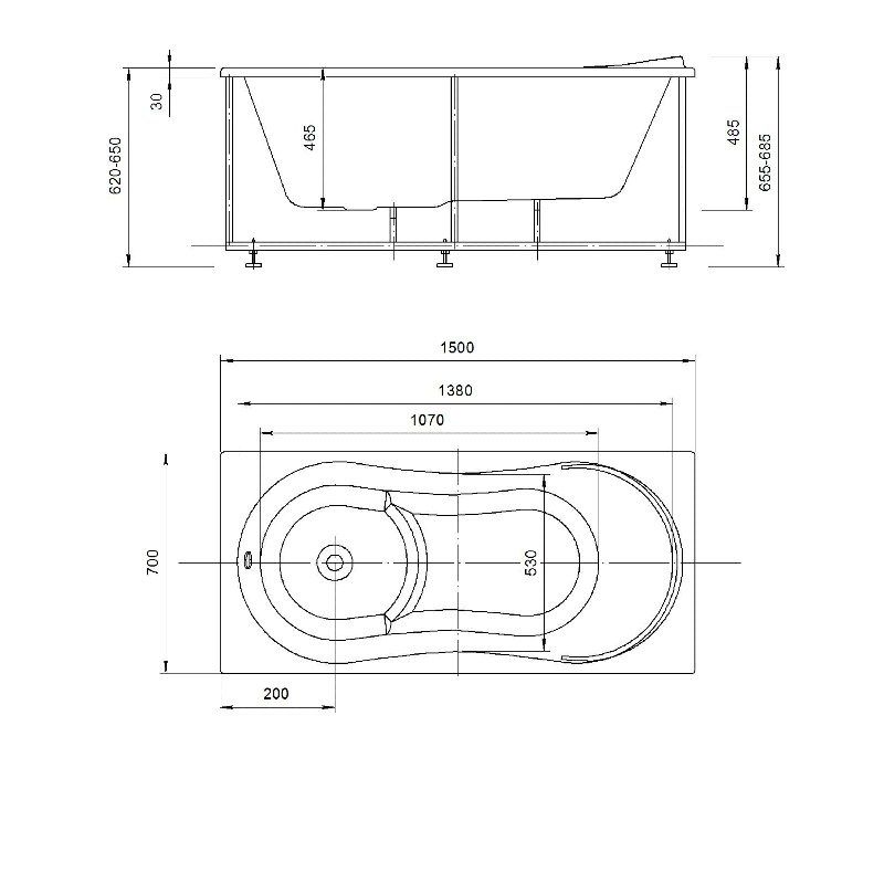 Длина, см:150Ширина, см:70Высота, см:65,5–68,5Глубина, см:46,5Форма:ПрямоугольнаяВнутр. размер дна, см:107Внутр. размер ванны, см:138Внутренняя ширина, см:53Макс. емкость, л:190-