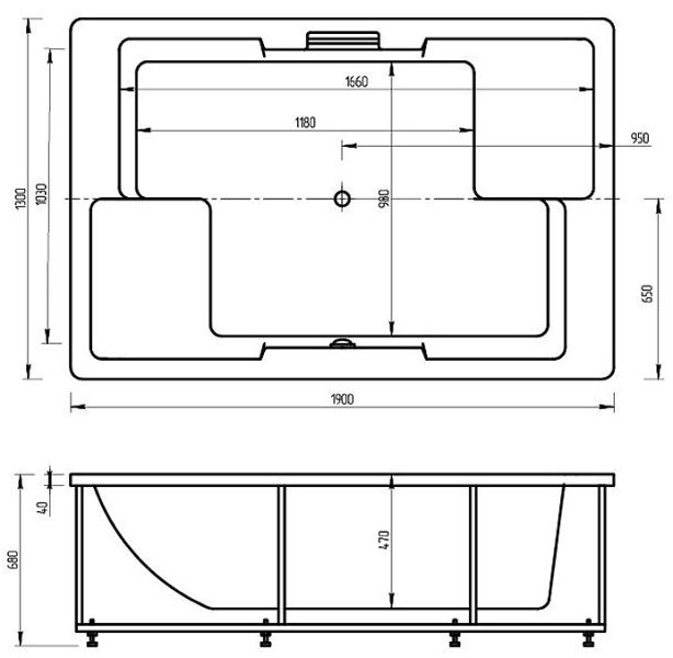 Длина, см:190Ширина, см:130Высота, см:67–71Глубина, см:47Форма:ПрямоугольнаяВнутр. размер дна, см:118Внутр. размер ванны, см:166Внутренняя ширина, см:98Макс. емкость, л:520Вес, кг:110