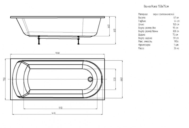 Акриловая ванна АКВАТЕК EFVN150 Ника 150x75 смДанная ванна станет идеальным решением для тех, кто ищет максимально простую и дешевую модель, не желая при этом терять в качестве.Каркас,слив-перелив,фронтальная панель приобретаеться отдельно.