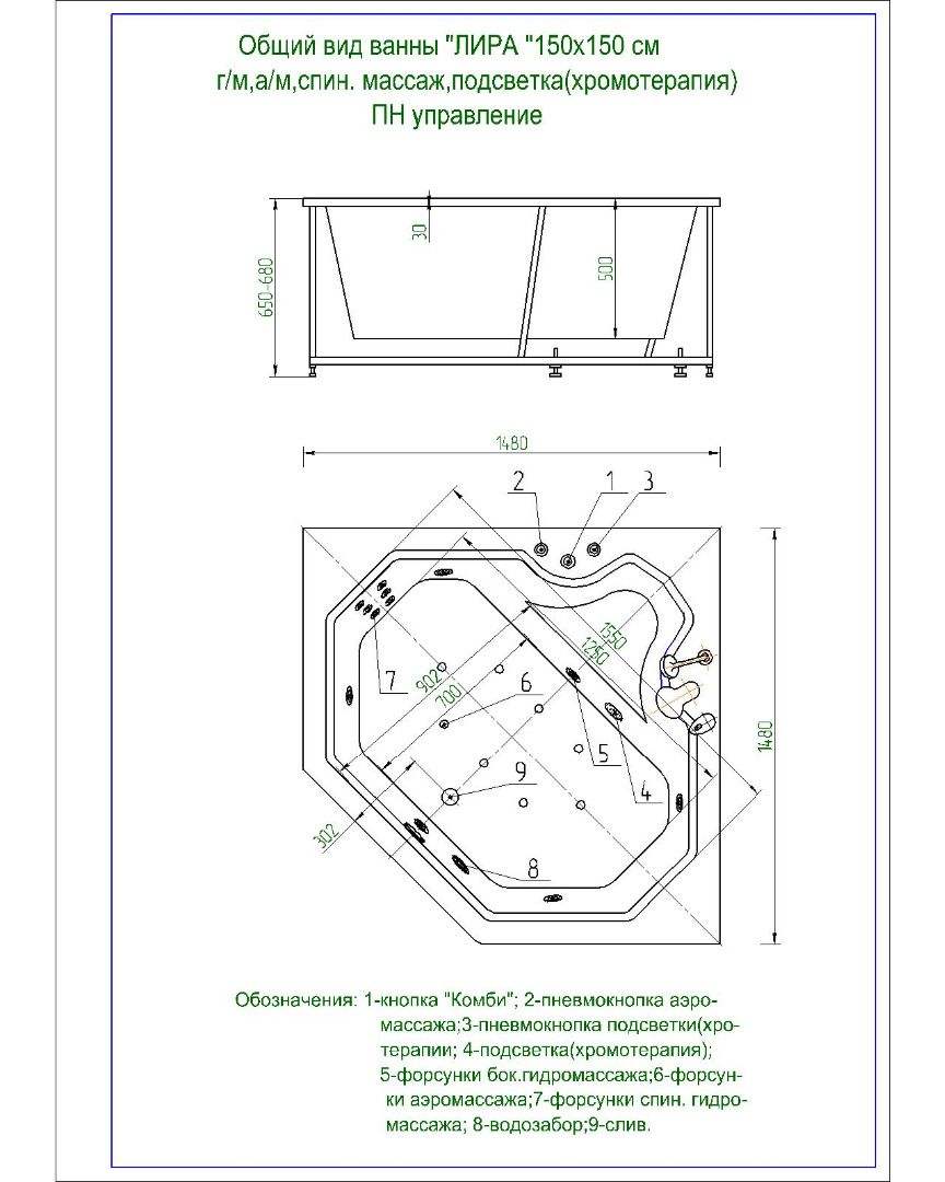 Длина, см:148Ширина, см:148Высота, см:65–68Глубина, см:50Форма:УгловаяВнутр. размер дна, см:125Внутр. размер ванны, см:155Внутренняя ширина, см:90Макс. емкость, л:320Вес, кг:60