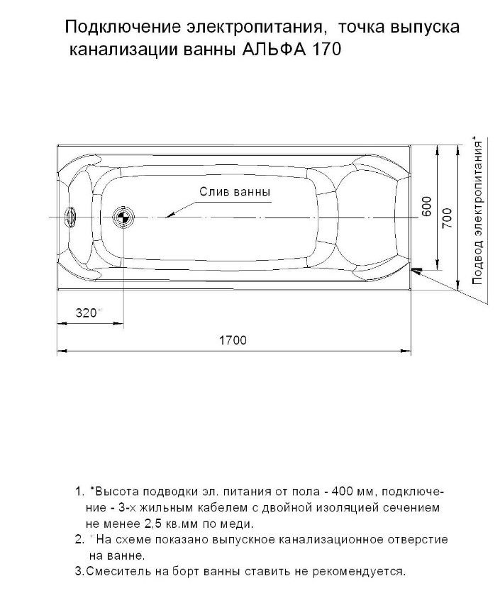 Габариты (Д Ш), см: 170х70Высота с опорой, см: 66Объем, л: 280 Форма: прямоугольнаяМонтаж: пристеннаяРасположение перелива: стандартноеДиаметр слива ванны, см: 5,2Материал: 100% литьевой акрилТолщина акрилового листа, мм: 4Гарантия: 20 летСтрана: Россия Вид опоры: каркас сборно-разборный сварной, есть в комплектеЭкран: фронтальный, есть в комплектеЭкран боковой: нет, приобретаются отдельноСлив-перелив: есть, в комплектеПодголовник: приобретается отдельноРучки: приобретаются отдельно Система гидромассажа: установка по желаниюАэромассаж: установка по желаниюХромотерапия: установка по желаниюРучки, поручни для ванны: установка по желаниюВстроенные смесители: установка по желаниюИзменение конструкции каркаса: установка по желаниюОзонирование: нет, установка не предусмотренаЗащита от сухого пуска: установка по желаниюУправление: любое по желанию