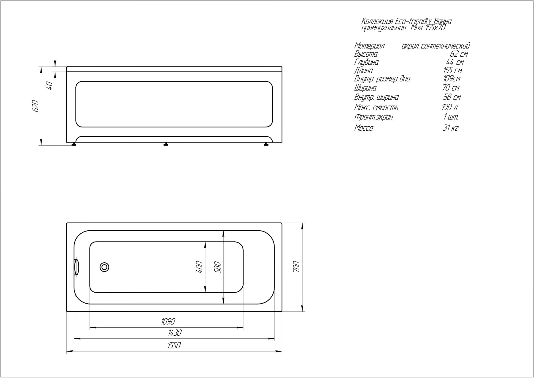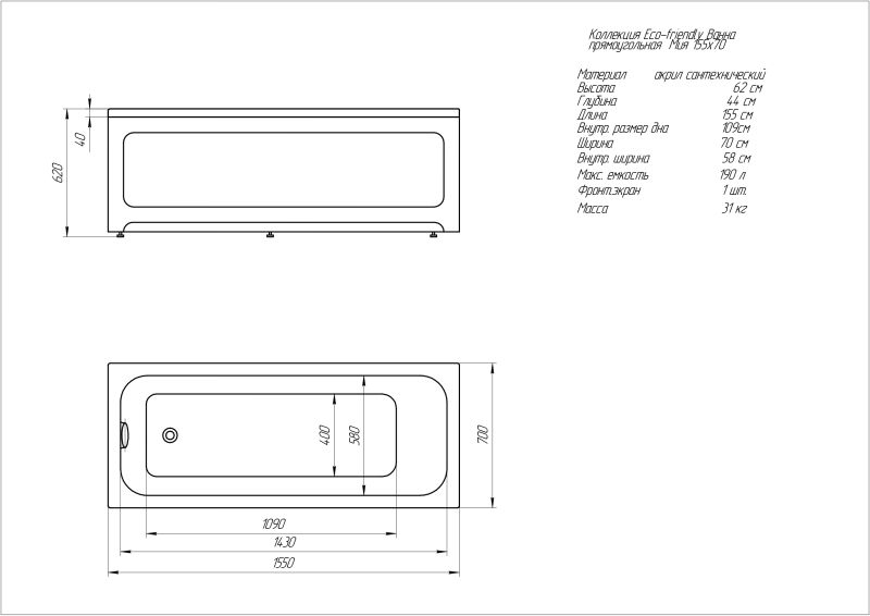 Габариты (Д Ш), см: 155х70Высота с опорой, см: 62Объем, л: 190 Форма: прямоугольнаяМонтаж: пристеннаяРасположение перелива: стандартноеДиаметр слива ванны, см: 5,2Материал: 100% литьевой акрилЦвет: белыйГарантия: 20 летСтрана: Россия Вид опоры: каркас сборно-разборный металлический (шпильки) или опорная конструкция (ножки), приобретается отдельноЭкран: фронтальный и боковой, приобретаются отдельноСлив-перелив: нет, приобретается отдельноНескользкая поверхность