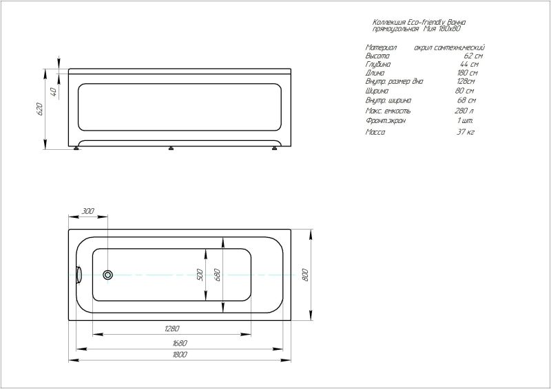 Габариты (Д Ш), см: 180х80Высота с опорой, см: 62Объем, л: 280 Форма: прямоугольнаяМонтаж: пристеннаяРасположение перелива: стандартноеДиаметр слива ванны, см: 5,2Материал: 100% литьевой акрилЦвет: белыйГарантия: 20 летСтрана: Россия Вид опоры: каркас сборно-разборный металлический (шпильки) или опорная конструкция (ножки), приобретается отдельноЭкран: фронтальный и боковой, приобретаются отдельноСлив-перелив: нет, приобретается отдельноАнтискользящее покрытие: нескользкая поверхность