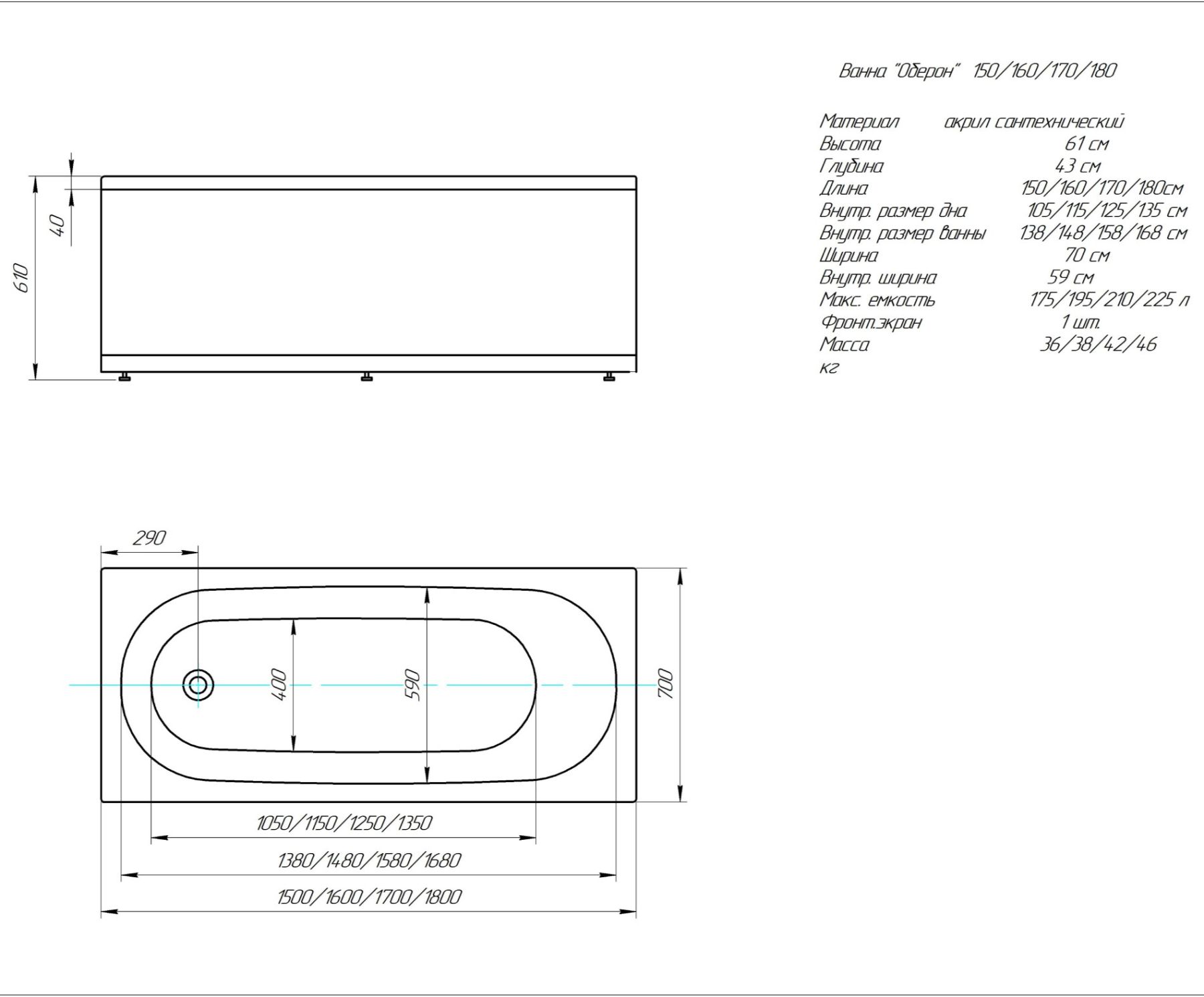 Габариты (Д Ш), см: 150х70Высота с опорой, см: 61Объем, л: 175 Форма: прямоугольнаяМонтаж: пристеннаяРасположение перелива: стандартноеДиаметр слива ванны, см: 5,1Материал: 100% литьевой акрилТолщина акрилового листа, мм: 4Гарантия: 20 летСтрана: Россия Вид опоры: каркас сборно-разборный сварной, есть в комплектеЭкран: фронтальный и боковой, приобретаются отдельноСлив-перелив: есть, в комплектеАнтискользящее покрытие: нескользкая поверхностьПодголовник: приобретается отдельноРучки: приобретаются отдельно Система гидромассажа: установка по желаниюАэромассаж: установка по желаниюХромотерапия: установка по желаниюРучки, поручни для ванны: установка по желаниюВстроенные смесители: установка по желаниюИзменение конструкции каркаса: установка по желаниюОзонирование: нет, установка не предусмотренаЗащита от сухого пуска: установка по желаниюУправление: любое по желанию