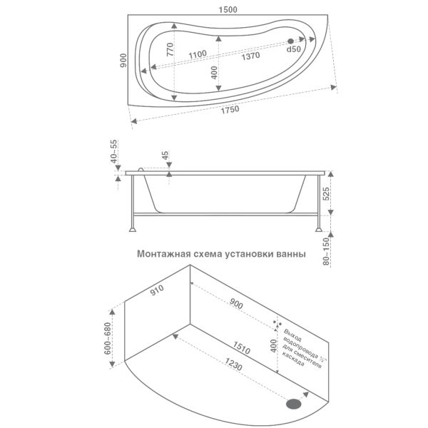 Слив-перелив:приобретается отдельноТолщина ванны, мм:4Серия:ОлимпЦвет:БелыйКаркас:приобретается отдельноШирина, см:150Длина (Глубина), см:90Глубина, см:50