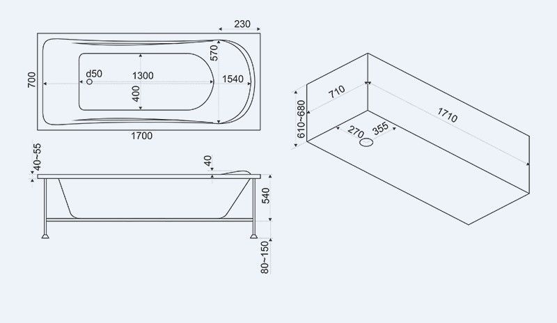 Состав поставки: Ванна, КаркасРазмеры: 1700 x 700 мм