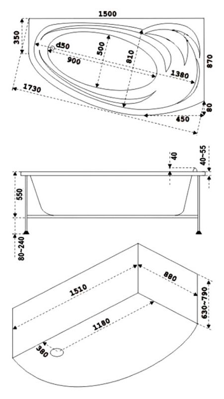 Глубина ванны по центру: 480 мм