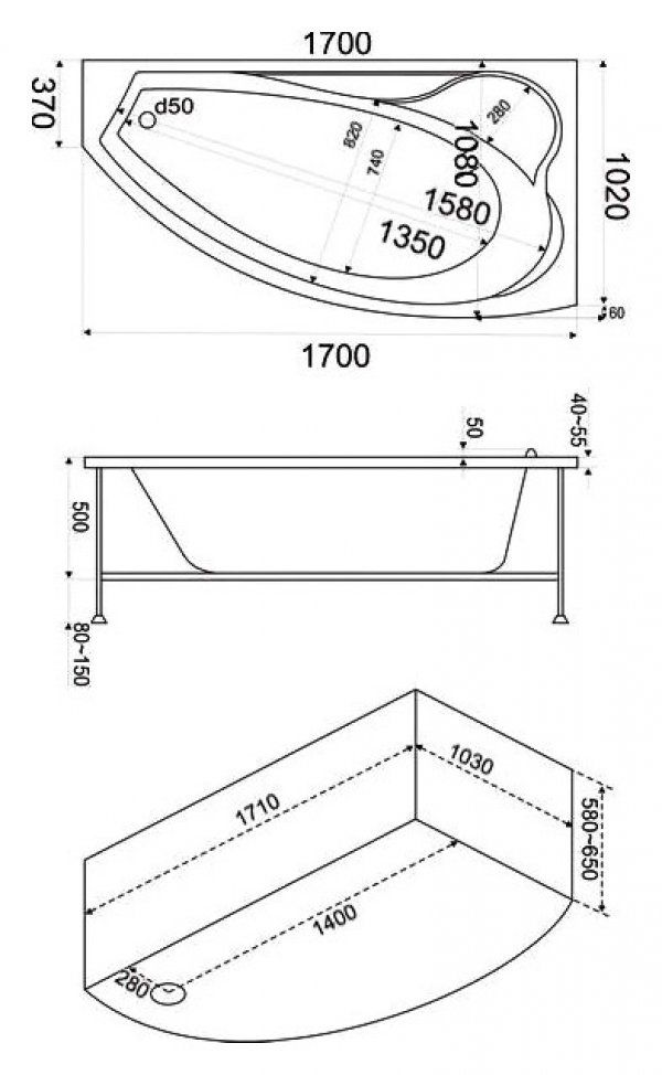 Акриловая ванна Bas Николь 170x100 см правая без гидромассажа