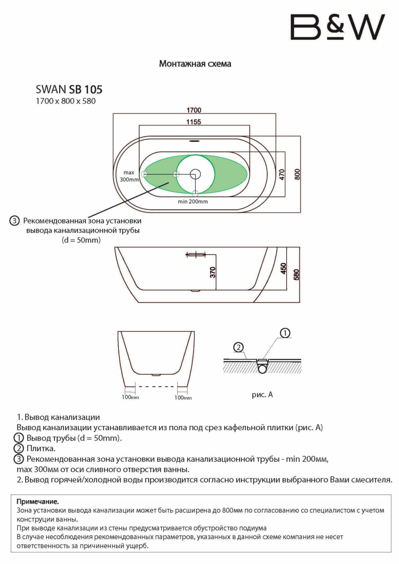 Акриловая ванна Black & White Swan 105SB00 170 x 80 см