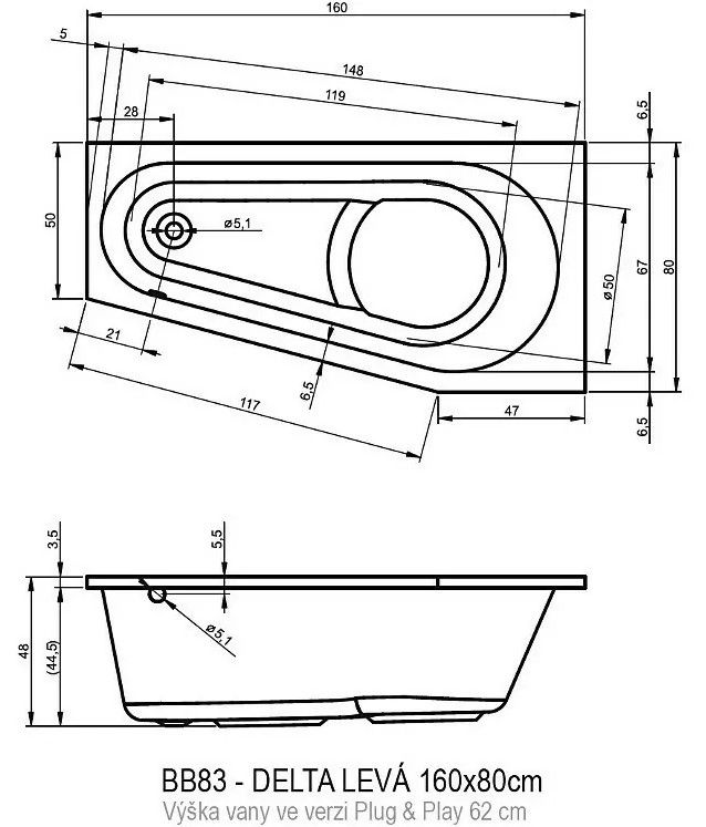 Акриловая ванна Riho Delta Plug and Play B067007005 L 160х80см белый