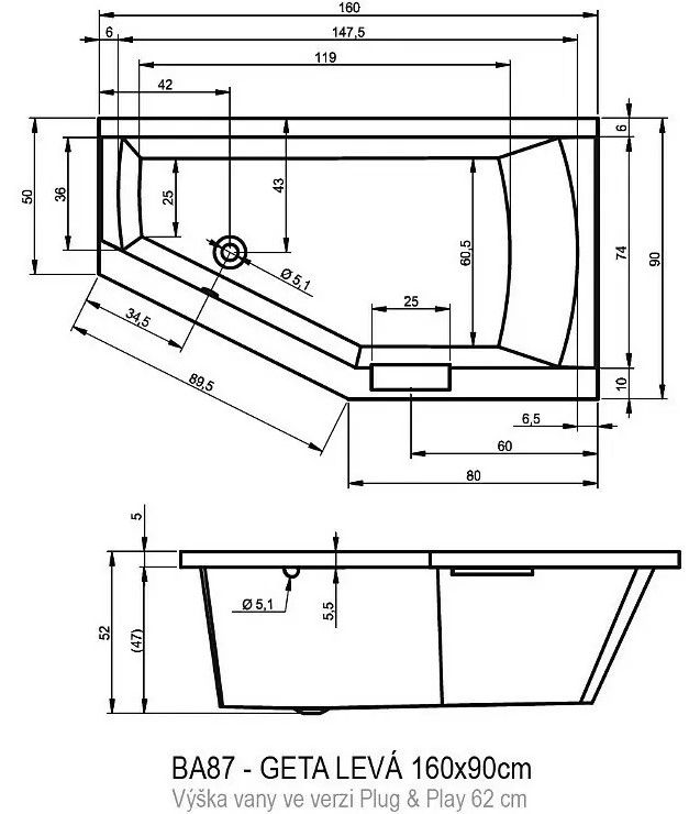 ?Асимметричная ванна RIHO Geta 160x90 L Plug & Play из глянцевого белого акрила, со скошенными краями и встроенной хромированной ручкой представляет собой полностью собранную на заводе конструкцию.