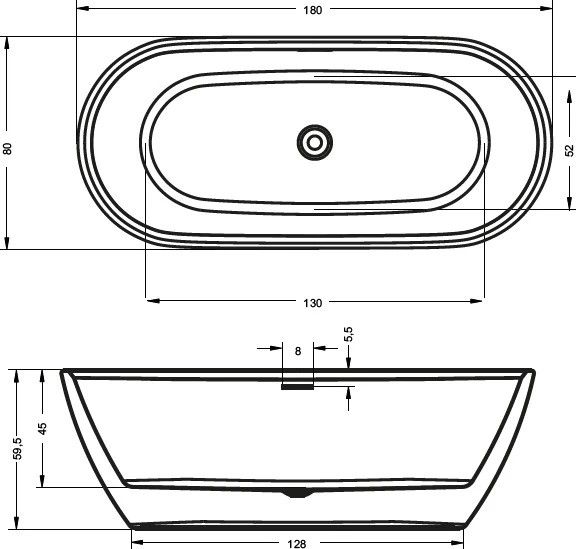Отдельно стоящая, матовая чёрная акриловая ванна RIHO Inspire 180х80 с двойными стенками, со встроенным переливом и нажимным донным клапаном.
