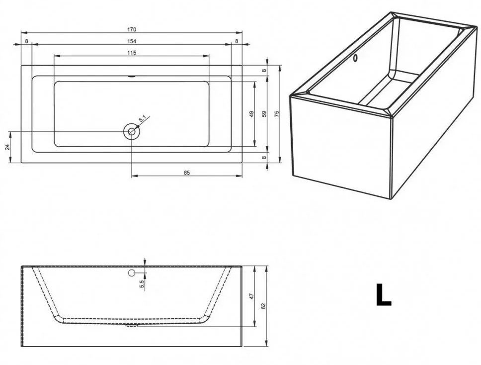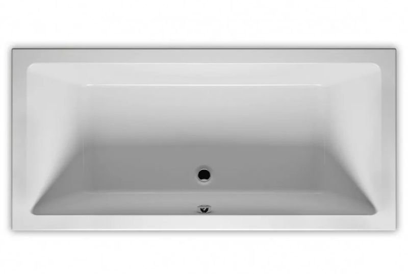 Прямоугольная? ванна RIHO Lugo 170x75 L Plug & Play, из глянцевого белого акрила с прямыми симметричными спинками, гладкой внутренней формой и центральным сливом, представляет собой полностью собранную на заводе конструкцию.