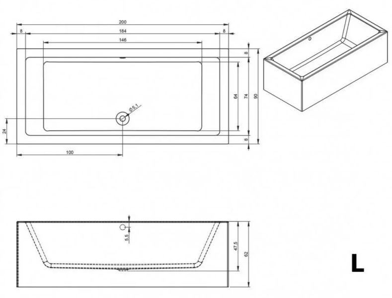 Прямоугольная? ванна RIHO Lugo 200x90 L Plug & Play, из глянцевого белого акрила с прямыми симметричными спинками, гладкой внутренней формой и центральным сливом, представляет собой полностью собранную на заводе конструкцию.