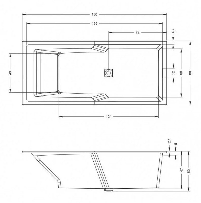 Слив смещён к центру, перелив расположен сбоку, поэтому ванну можно разместить как в правом, так и в левом углу.