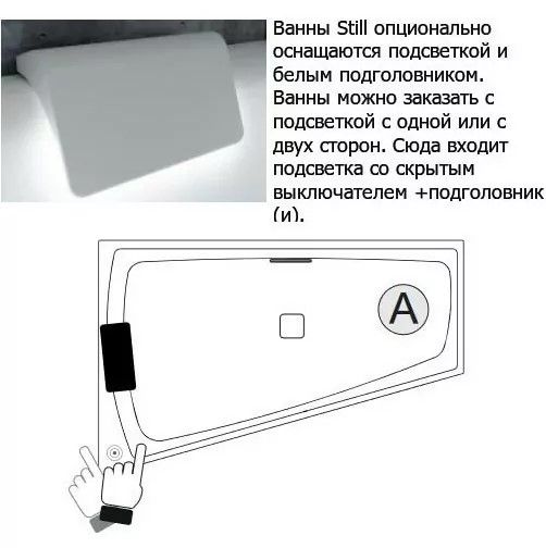 перелив). Тогда отдельный кран не потребуется. Подголовник выполнен с LED-подсветкой. Глянцевый белый слив-перелив и подголовник входят в комплектацию ванны.