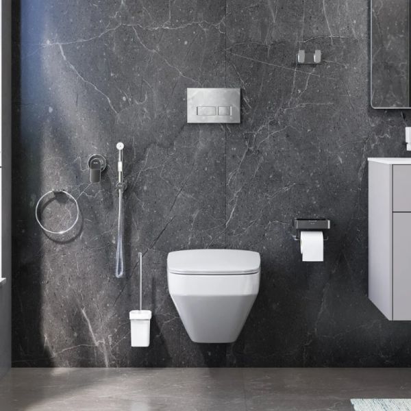 Тонкое быстросъемное сиденье из дюропласта оснащено петлями с механизмом плавного опускания Soft Close. Быстрое снятие при помощи нажатия на одну кнопку.