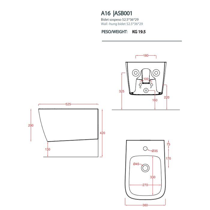 Биде Artceram A16 ASB001 39 00 cocoaArtceram A16 Биде подвесное 36х52 см, 1 отверстие, цвет cocoa