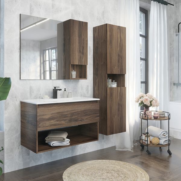 Подвесная шкаф-колонна с двумя створками и пространством для открытого хранения. Створки оснащены петлями с плавным закрыванием. За створками по две регулируемые по высоте полки.