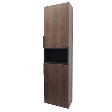 Подвесная шкаф колонна с двумя створками и пространством для открытого хранения. Створки оснащены петлями с плавным закрыванием и черными матовыми алюминиевыми ручками. Фасады из влагостойкого ЛДСП Дуб шоколадно-коричневый.