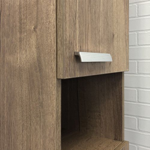 Подвесная шкаф колонна с двумя створками и пространством для открытого хранения. Створки оснащены петлями с плавным закрыванием и хромированными ручками.Корпус и фасады из влагостойкого ЛДСП дуб темный. За створками по две регулируемые по высоте полки.Шкаф-колонна универсальна, может быть подвешена переворачиванием в правом и левом варианте.
