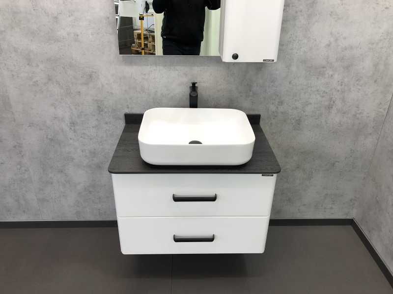 Тумба Comfortу Амстердам-75 белая с черной столешницей, с раковиной T-Y9378 (00-00004668)Подвесная тумба с двумя выкатными ящиками оснащенными системой плавного закрывания. Оригинальные эргономичные ручки. Тумба укомплектована столешницей (текстура - брашированная древесина) и плинтусом из темно-серого керамогранита и накладной прямоугольной раковиной.Фасад тумбы покрыт глянцевой эмалью, что добавит приятных тактильных ощущений.Исправно прослужит на протяжении всего срока эксплуатации.Два выдвижных ящика.Тумба укомплектована санфаянсовой раковиной COMFORTY T-Y9378.Механизм плавного закрытия ящика.Цвет: белый глянец.Цвет фурнитур: черный.Габариты (ШхВхГ): 75х63х50 см.Материал: ДСП, МДФ.Материал раковины: санфарфор.Монтаж: подвесной.В комплекте :тумба;