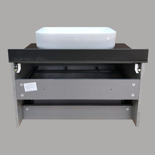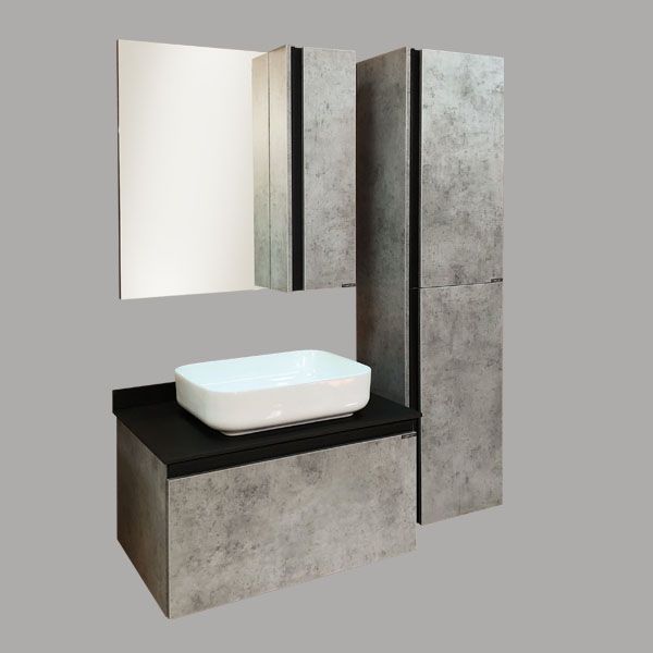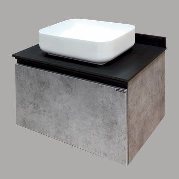 Тумба укомплектована столешницей и плинтусом из черного керамогранита и накладной прямоугольной раковиной Comforty T-Y9378. Корпус и фасады тумбы изготовлена из влагостойкого ДСП цвета "Бетон светлый". Тумба подготовлена для подключения водоснабжения снизу.