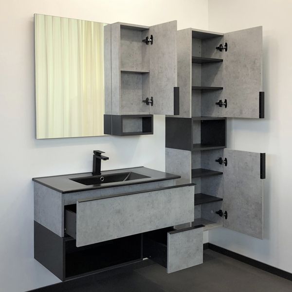Тумба-умывальник в современном стиле с выкатным ящиком и пространством для открытого хранения. Тумба укомплектована черной матовой алюминиевой ручкой и системой плавного закрывания ящика. Тумба подготовлена для подключения водоснабжения снизу.