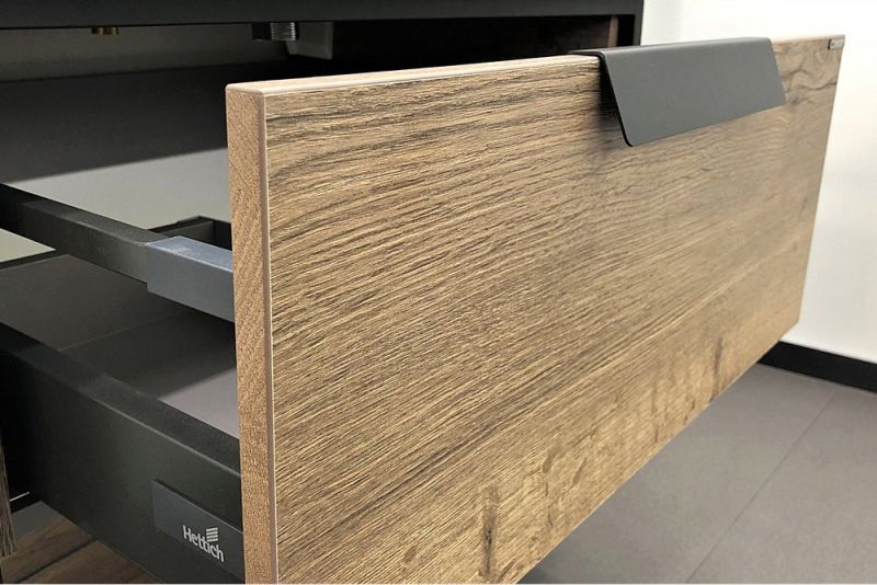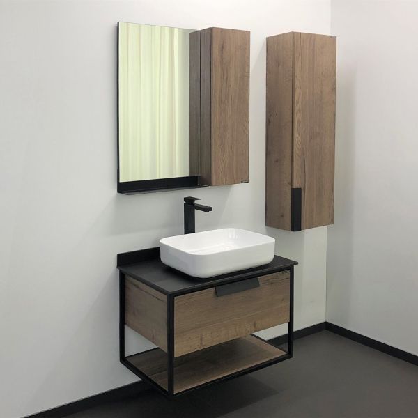 Подвесная тумба-умывальник в стиле лофт с одним выкатным ящиком оснащенным системой плавного закрывания и нижней полкой открытого хранения. В основе тумбы - каркас из стального профиля окрашенный в цвет черный муар.