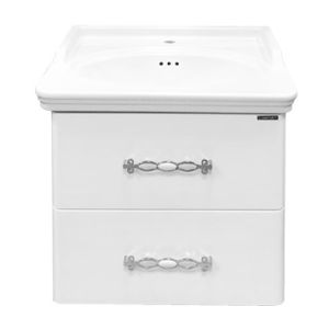 Тумба-умывальник с двумя выкатными ящиками, оснащенными системой плавного закрывания. Фасады выполнены из МДФ и покрыты белой глянцевой эмалью. Раковина с овальной чашей и оригинальными отверстиями перелива.