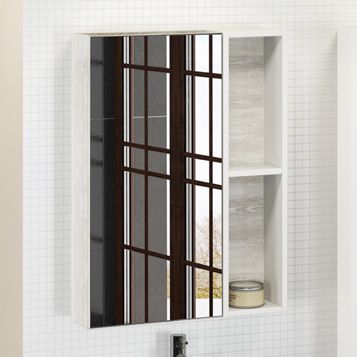 Высококачественное зеркальное полотно с амальгамой на основе серебра. Створка оснащена петлями с плавным закрыванием. Петли у створки снаружи. За зеркальной створкой две горизонтальные полки, в пространстве открытого хранения - одна. Зеркало-шкаф универсально - может быть подвешено в правом и левом варианте.