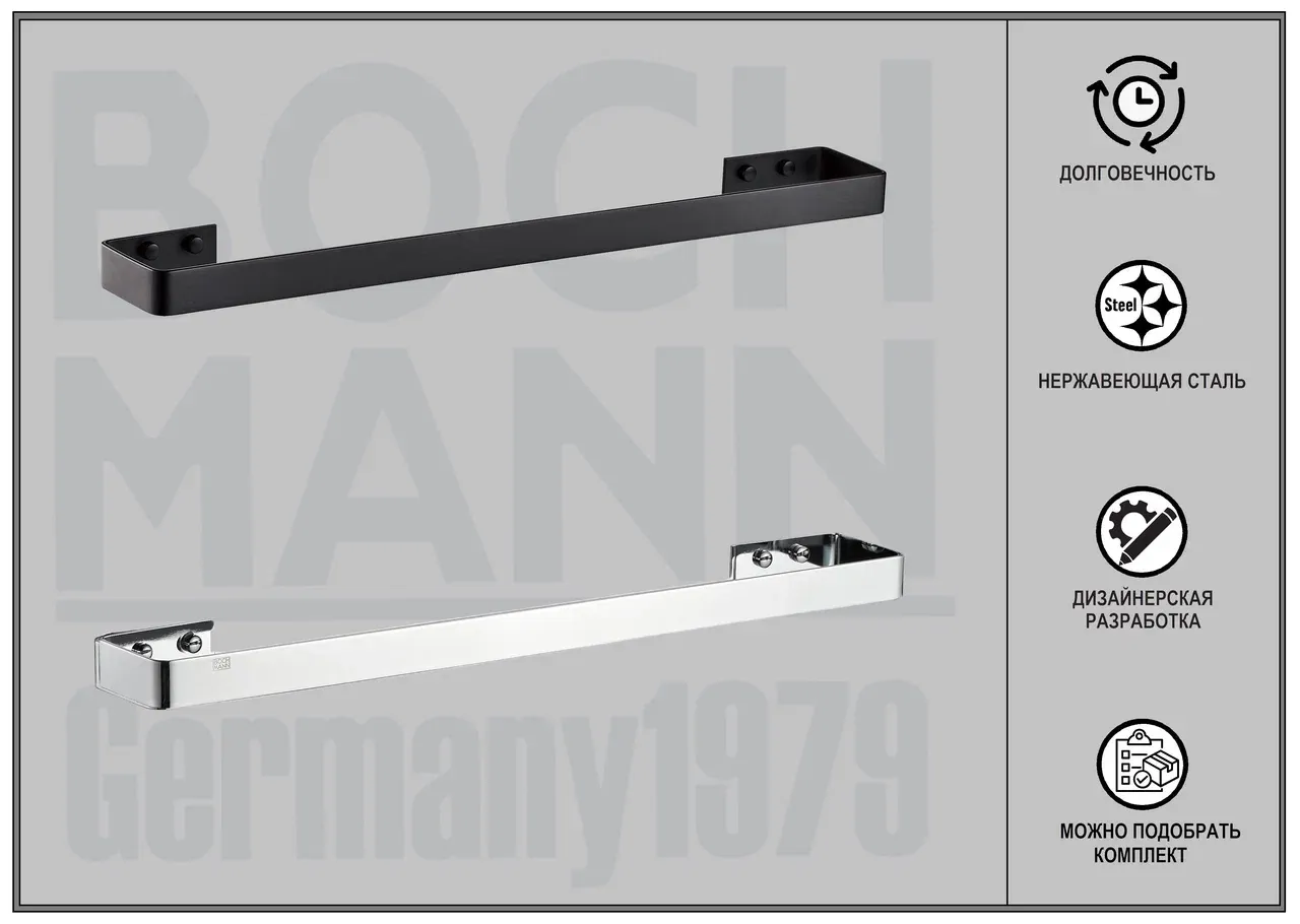 Ванная комната является одним из любимых и часто посещаемых мест человека. Мы проводим там больше 14 тысяч часов за всю жизнь, поэтому она обязательно должна быть не только уютной, но и эргономичной. Ни одна ванная комната не может обойтись без аксессуаров - незаметных на первый взгляд, но совершенно необходимых вещей, которые делают жизнь нашу намного комфортней. Они не только практичны, но и создают общую атмосферу ванной комнаты, придают ей индивидуальность и шарм.Дизайнерские аксессуары BOCH MANN стилистически завершают образ ванной комнаты, создавая целостную и продуманную концепцию. Их функциональный дизайн позволяет дополнить практически любой интерьер, а широкий ассортимент предоставляет свободу выбора. Так как срок службы аксессуаров для ванных и туалетных комнат напрямую зависит от материала, из которого они изготовлены, в производстве аксессуаров BOCH MANN используются только материалы самого высокого качества – нержавеющая сталь и закалённое стекло. Изделия из нержавеющей стали — рекордсмены по сроку службы, сохранению отличного внешнего вида и высоких эксплуатационных характеристик. Надежность конструкций аксессуаров BOCH MANN, профессиональное крепление и прочность покрытия позволяют использовать изделия не только в домашних условиях, но также и в общественных местах, включая отели и рестораны. Безупречность исполнения каждой детали, точность даже в мелочах — это признаки истинной элитарности бренда BOCH MANN. Преимущества:- эстетический внешний вид;- высококачественные материалы – нержавеющая сталь;- тип крепления – скрытый, отличающийся повышенной надёжностью;- два варианта цветов – классический черный и универсальный хром;- чёткие формы каждой детали;- качество, проверенное годами. Внимание! Производитель оставляет за собой право вносить изменения в конструкцию и комплектацию моделей без предварительного уведомления!