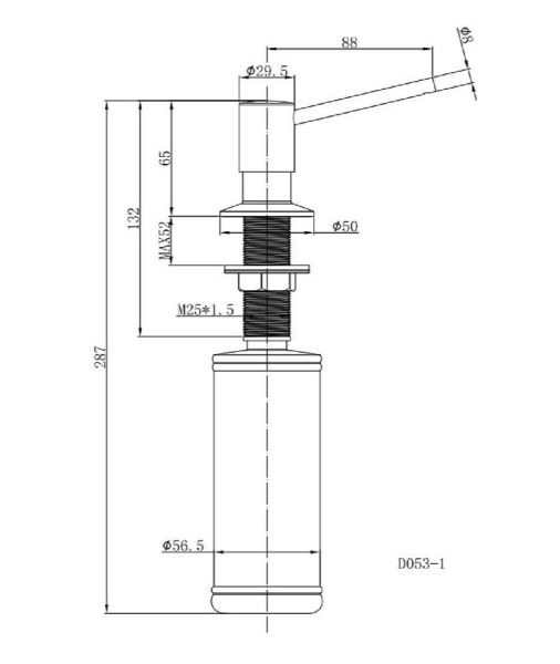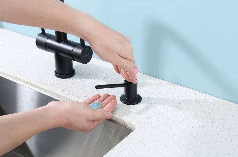 Дозатор встраиваемый для жидкого моющего средства Raglo R720.01.06 - отличный аксессуар для вашей кухни. Устанавливается в отверстие в столешнице Ф25 - 35 мм и фиксируется при помощи прижимной гайки на резьбе, рядом со смесителем для кухни. А со смесителями R80.62.06, R81.64.06, S70.61.06 составит прекрасный дуэт. Потому что выполнены они в одном цвете - черный. Толщина столешницы возможна от 1 до 5 см. Головка дозатора из латуни, колба объемом 350 мл из прочного пластика. Нажатие мягкое, носик дозатора поворачивается на 360 градусов. Дозатор легко монтируется на столешницу и весьма удобно и просто происходит пополнение моющего средства. Дозатор превосходно организует пространство у мойки и несомненно украсит ее.