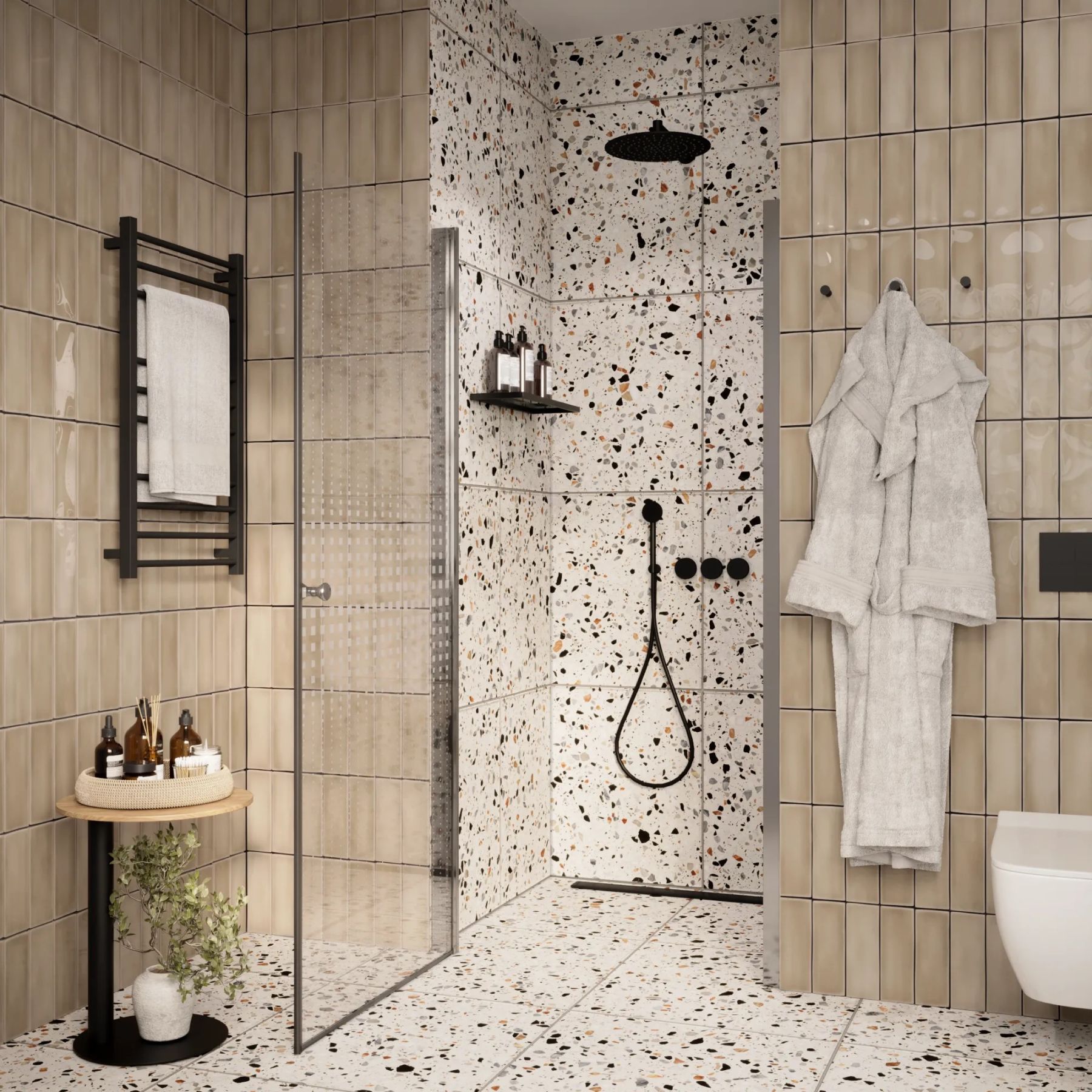 Душевая дверь помогает зонировать помещение на отдельные функциональные участки.