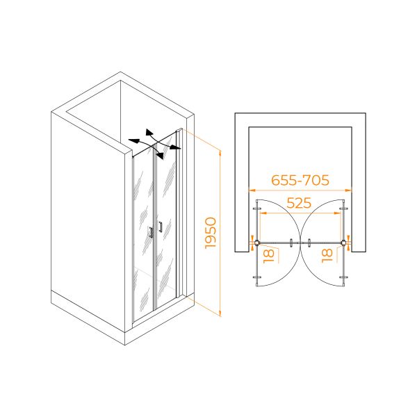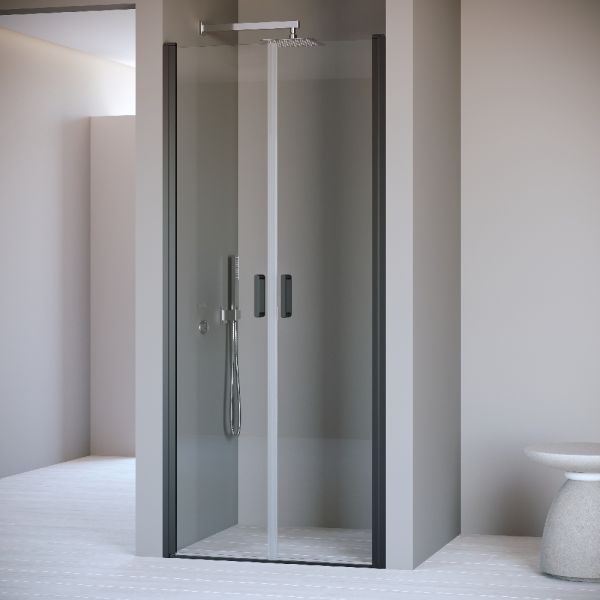 Душевая дверь распашная двустворчатая маятниковая. Маятниковые петли с функцией подъема двери. В комплекте нижняя пороговая планка. Трап или поддон приобретается отдельно.