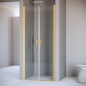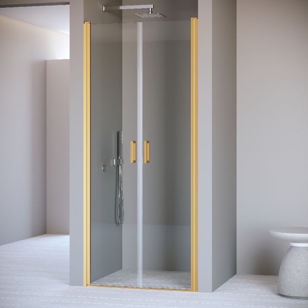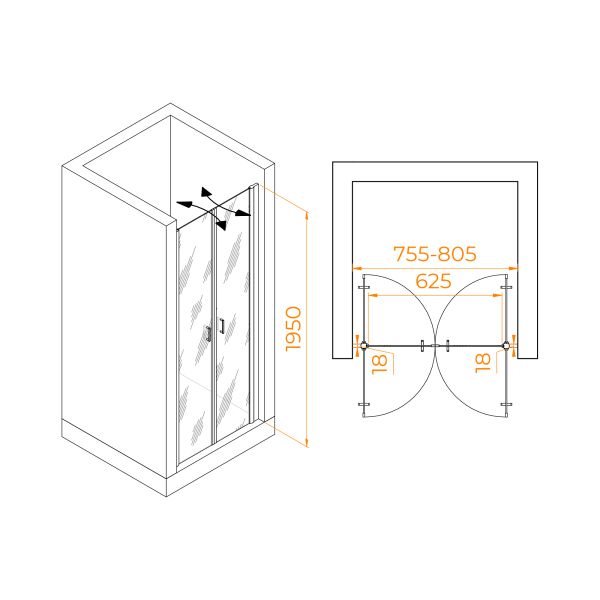 Душевая дверь распашная двустворчатая маятниковая. Маятниковые петли с функцией подъема двери. В комплекте нижняя пороговая планка. Трап или поддон приобретается отдельно.