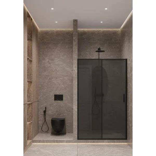 Душевая дверь Timo T05, 150 х 195 см, стекло тонированное, профиль черныйДушевая раздвижная дверь Timo является изысканным и практичным вариантом для вашей ванной комнаты. Этот стильный элемент выполнен из высококачественных материалов и предлагает максимальный комфорт, и удобство во время водных процедур. Надежные роликовые механизмы обеспечивают плавное и бесшумное движение двери, что подтверждает её долговечность и стабильность эксплуатации. Дополнительно, конструкция включает мягкие уплотнители, которые предотвращают протекание воды. Раздвижная душевая дверь станет отличным акцентом вашей ванной комнаты.
