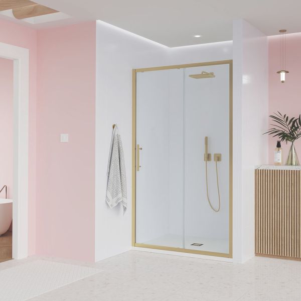 Душевая дверь Veconi Evo 100 G, 1100x1950, золото брашинг, стекло прозрачное купить
