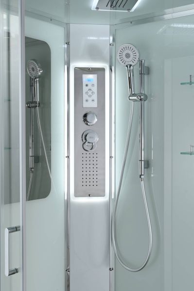 Стильная душевая кабина AvaCan сочетает в себе высокую функциональность, практичность и надежность. При изготовлении применяется безопасное закаленное стекло, надежно фиксируемое алюминиевым профилем.Профиль сделан из алюминия повышенной прочности. Сборка без силикона (увеличивает срок службы, защищает от протечек), внутренняя сборка (облегчает установку и ревизию; позволяет установить в ограниченном пространстве и обойтись без демонтажа других сантехнических приборов), смеситель резьбовой (без хомутов). Съемный экран поддона (позволяет осуществлять подключение и ревизию сифона).Двойные металлические ролики дверей (распределение нагрузки на два ролика, увеличивают срок службы). Душевая штанга(позволяет регулировать по высоте ручную лейку), ручная арома-лейка с витамином С (картридж в комплекте,есть возможность замены или удаления картриджа), полочки(из стекла, с ограничителем), сифон с гидрозатвором, сенсорный пульт управления с функциями: блютуз, LED подсветка, радио, вытяжка, гидромассаж спины, тропический (верхний) душ.