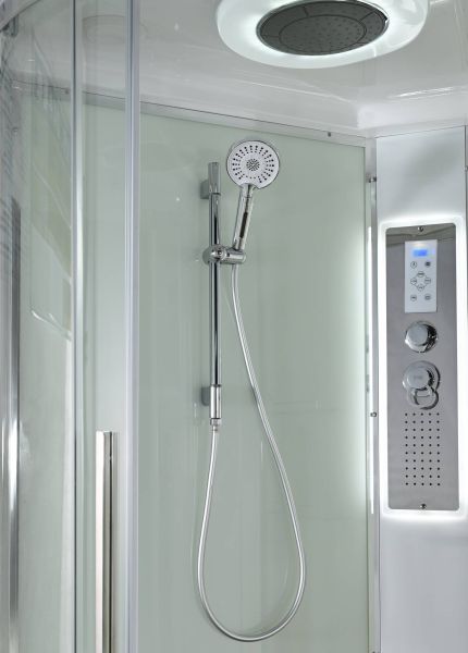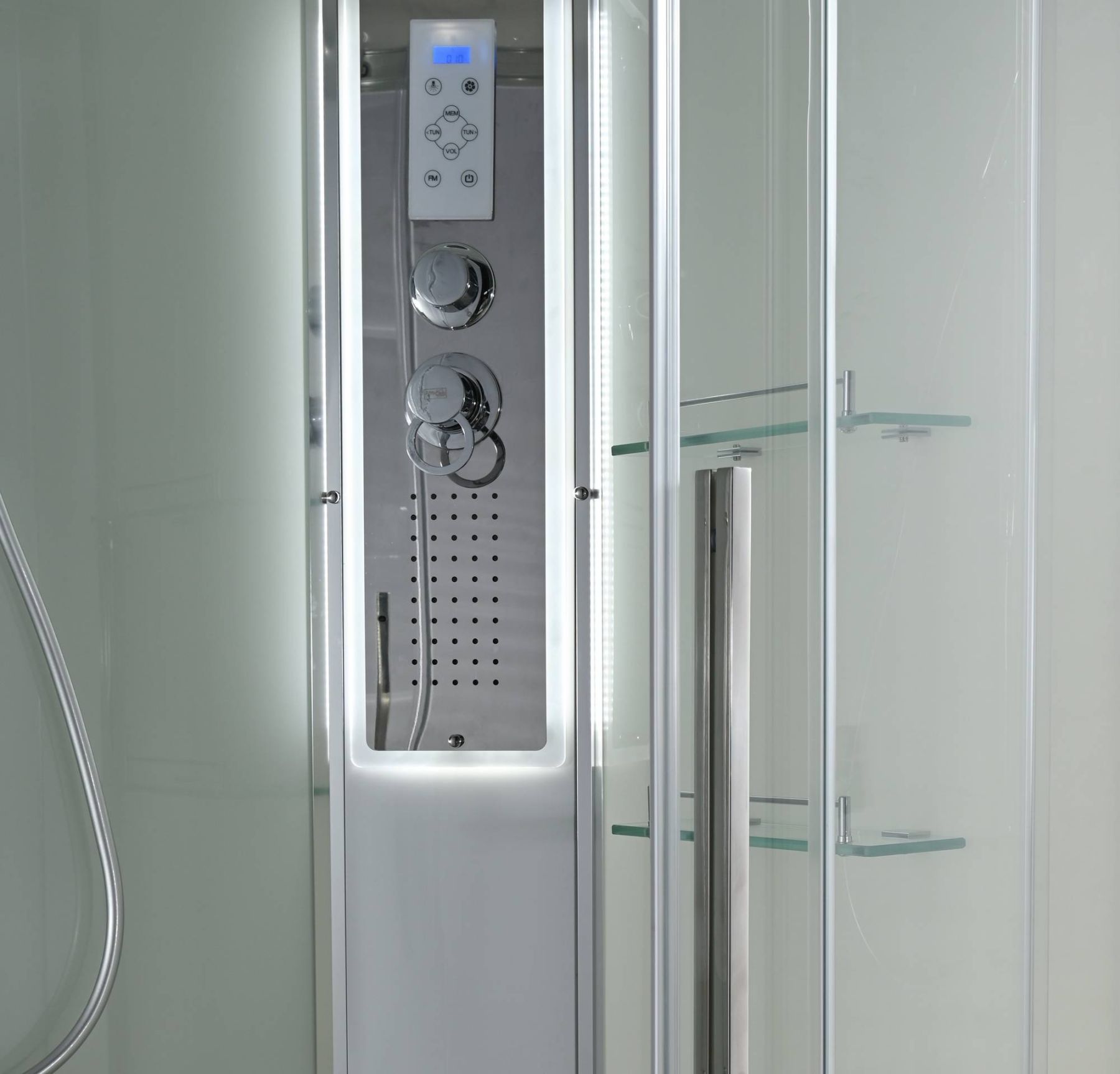 Стильная душевая кабина AvaCan EM2812RLEDT сочетает в себе высокую функциональность, практичность и надежность. При изготовлении применяется безопасное закаленное стекло толщиной 5 мм (прозрачное), надежно фиксируемое алюминиевым профилем. Сборка без силикона (увеличивает срок службы), внутренняя сборка(облегчает установку и ревизию; позволяет установить в ограниченном пространстве), смеситель резьбовой (без хомутов). Съемный экран поддона (позволяет осуществлять ревизию сифона). Цвет профиля  хром. Двойные металлические ролики дверей (увеличивают срок службы).В комплекте : душевая штанга, две полочки , тропический (верхний) душ, арома-лейка с витамином С (картридж съемный),полимерная вставка в поддон(имитация дерева),сифон, ручки дверей из нержавейки , двойные ролики ,пульт сенсорный(Блютуз ,LED подсветка ,радио ,вытяжка),гидромассаж спины.