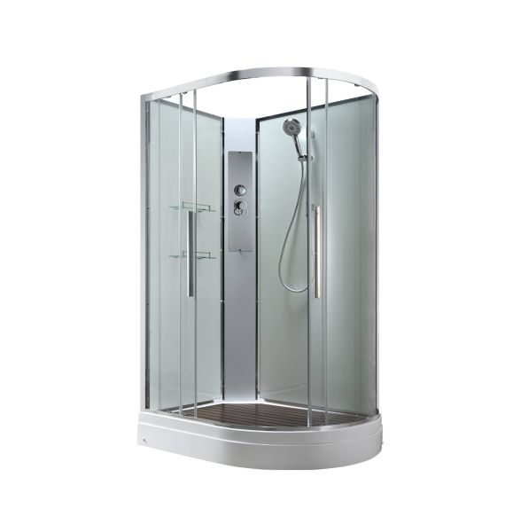 Стильная душевая кабина AvaCan EM2912LNT сочетает в себе высокую функциональность, практичность и надежность. При изготовлении применяется безопасное закаленное стекло толщиной 5 мм (прозрачное), надежно фиксируемое алюминиевым профилем. Сборка без силикона (увеличивает срок службы), внутренняя сборка(облегчает установку и ревизию; позволяет установить в ограниченном пространстве), смеситель резьбовой (без хомутов). Съемный экран поддона (позволяет осуществлять ревизию сифона). Цвет профиля  хром. Двойные металлические ролики дверей (увеличивают срок службы).В комплекте : душевая штанга, две полочки , арома-лейка с витамином С (картридж съемный),полимерная вставка в поддон(имитация дерева),сифон, ручки дверей из нержавейки , двойные ролики .