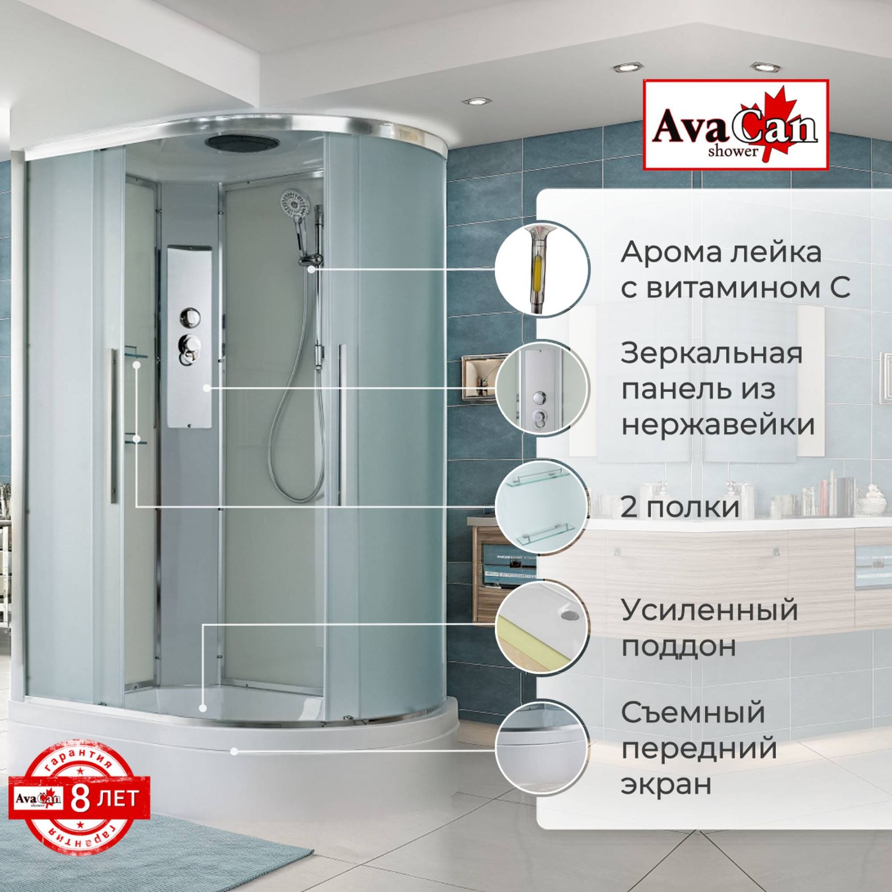 Стильная душевая кабина AvaCan сочетает в себе высокую функциональность, практичность и надежность. При изготовлении применяется безопасное закаленное стекло, надежно фиксируемое алюминиевым профилем. Профиль сделан из алюминия повышенной прочности. Сборка без силикона (увеличивает срок службы, защищает от протечек), внутренняя сборка (облегчает установку и ревизию; позволяет установить в ограниченном пространстве и обойтись без демонтажа других сантехнических приборов), смеситель резьбовой (без хомутов). Съемный экран поддона (позволяет осуществлять подключение и ревизию сифона).Двойные металлические ролики дверей (распределение нагрузки на два ролика, увеличивают срок службы). Душевая штанга(позволяет регулировать по высоте ручную лейку), ручная арома-лейка с витамином С (картридж в комплекте,есть возможность замены или удаления картриджа), полочки(из стекла, с ограничителем), сифон с гидрозатвором.
