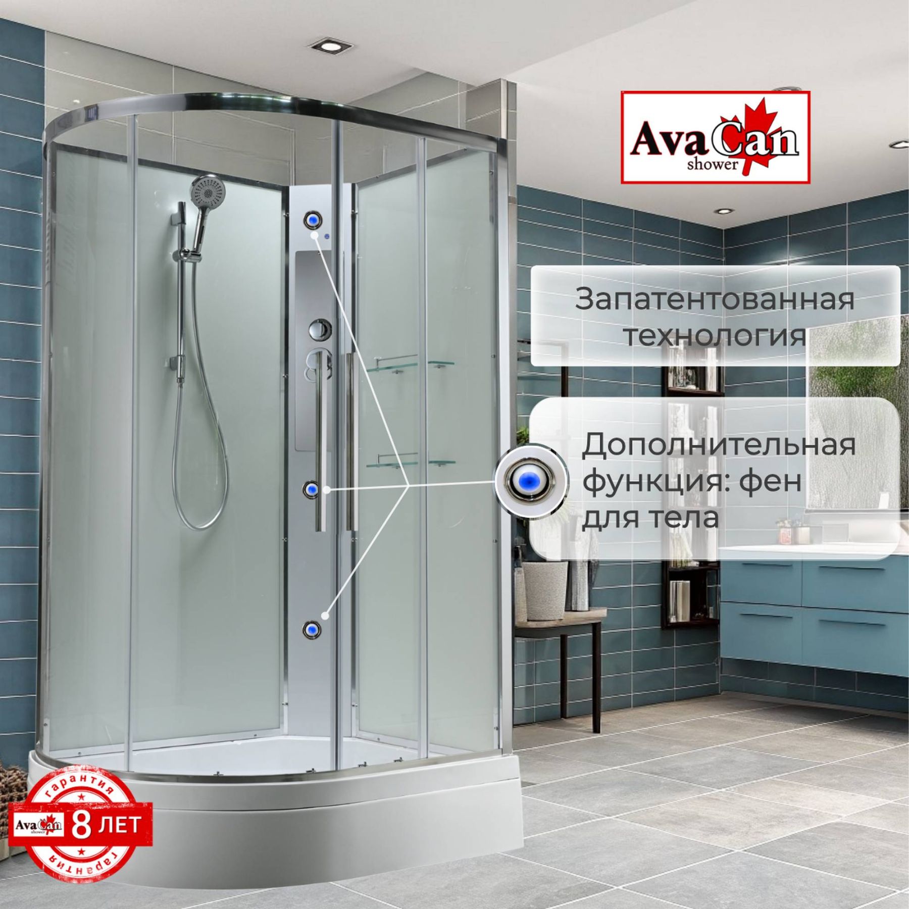 Стильная душевая кабина AvaCan сочетает в себе высокую функциональность, практичность и надежность. При изготовлении применяется безопасное закаленное стекло, надежно фиксируемое алюминиевым профилем. Профиль сделан из алюминия повышенной прочности. Сборка без силикона (увеличивает срок службы, защищает от протечек), внутренняя сборка (облегчает установку и ревизию; позволяет установить в ограниченном пространстве и обойтись без демонтажа других сантехнических приборов), смеситель резьбовой (без хомутов). Съемный экран поддона (позволяет осуществлять подключение и ревизию сифона).Двойные металлические ролики дверей (распределение нагрузки на два ролика, увеличивают срок службы). Душевая штанга(позволяет регулировать по высоте ручную лейку), ручная арома-лейка с витамином С (картридж в комплекте,есть возможность замены или удаления картриджа), полочки(из стекла, с ограничителем), сифон с гидрозатвором.