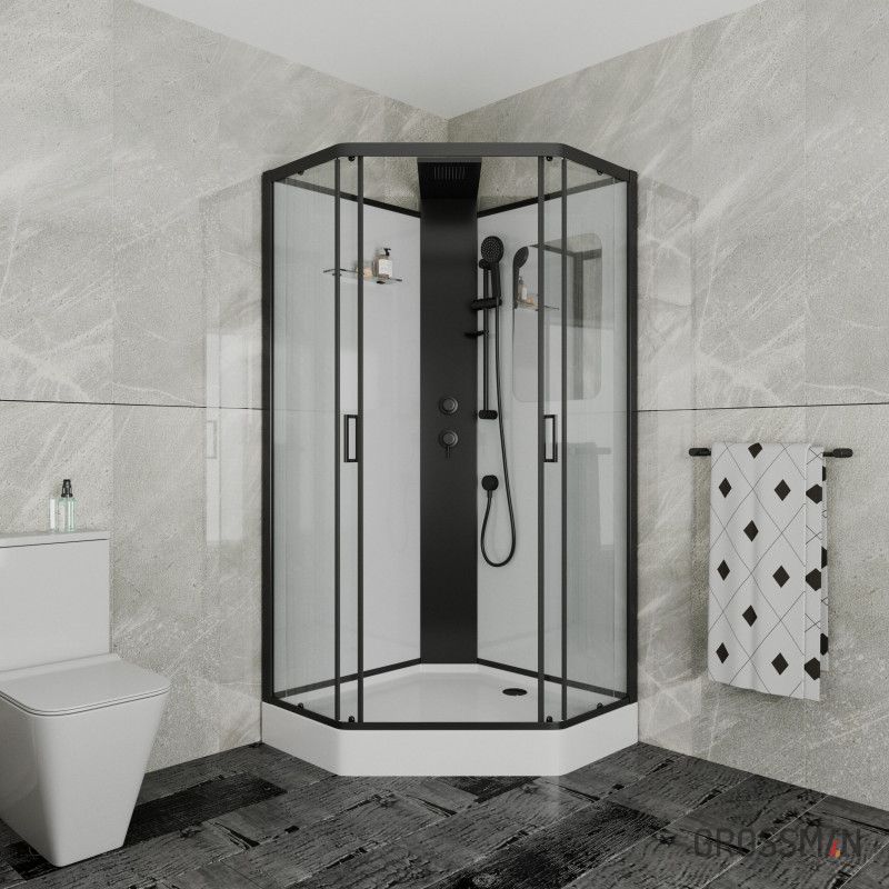 Пятиугольная душевая кабина Grossman GR-250D выглядит лёгкой и невесомой несмотря на довольно просторные габаритные размеры 100 на 100 см. Всё дело в дизайне, в котором белоснежный поддон и задние стенки кабины подчёркнуты строгим чёрным профилем. При этом переднее ограждение полностью прозрачное. Широкая центральная стойка также в матовом чёрном цвете размещена в установочном углу. Визуально облегчает конструкцию и отсутствие крыши. При этом данная модель оборудована верхним тропическим душем. Его лейка является продолжением центральной стойки. Помимо него есть и ручной душ. Его лейку можно установить на удобной высоте при помощи держателя на штанге. Они также выполнены в чёрном цвете.