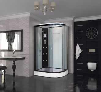 Поддон акриловый низкий 16см, глубина 5см, сифон с гофрой,экран несъемный,профиль черный,центральная панель черная, задние стенки закаленные,белые,крашенные, передние стекла закаленные,тонированные, смеситель 3-х режимный, полочка,пульт,подсветка, верхний душ,ручной душ,зеркало,гидромассаж. Разворот кабины(L/R)определяется по прямому углу.