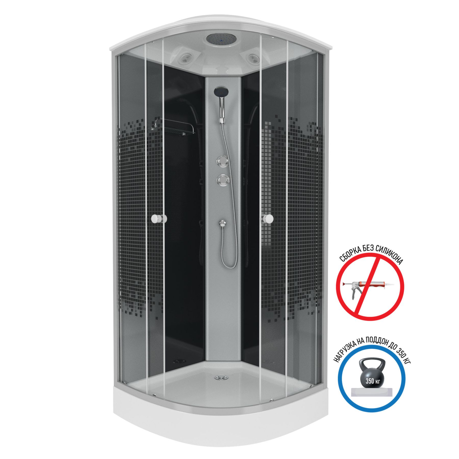 передние стекла прозрачные, рисунок-мозаика, вентиляция, смеситель 2-х режимный, тропический душ, ручной душ, одинарные ролики.