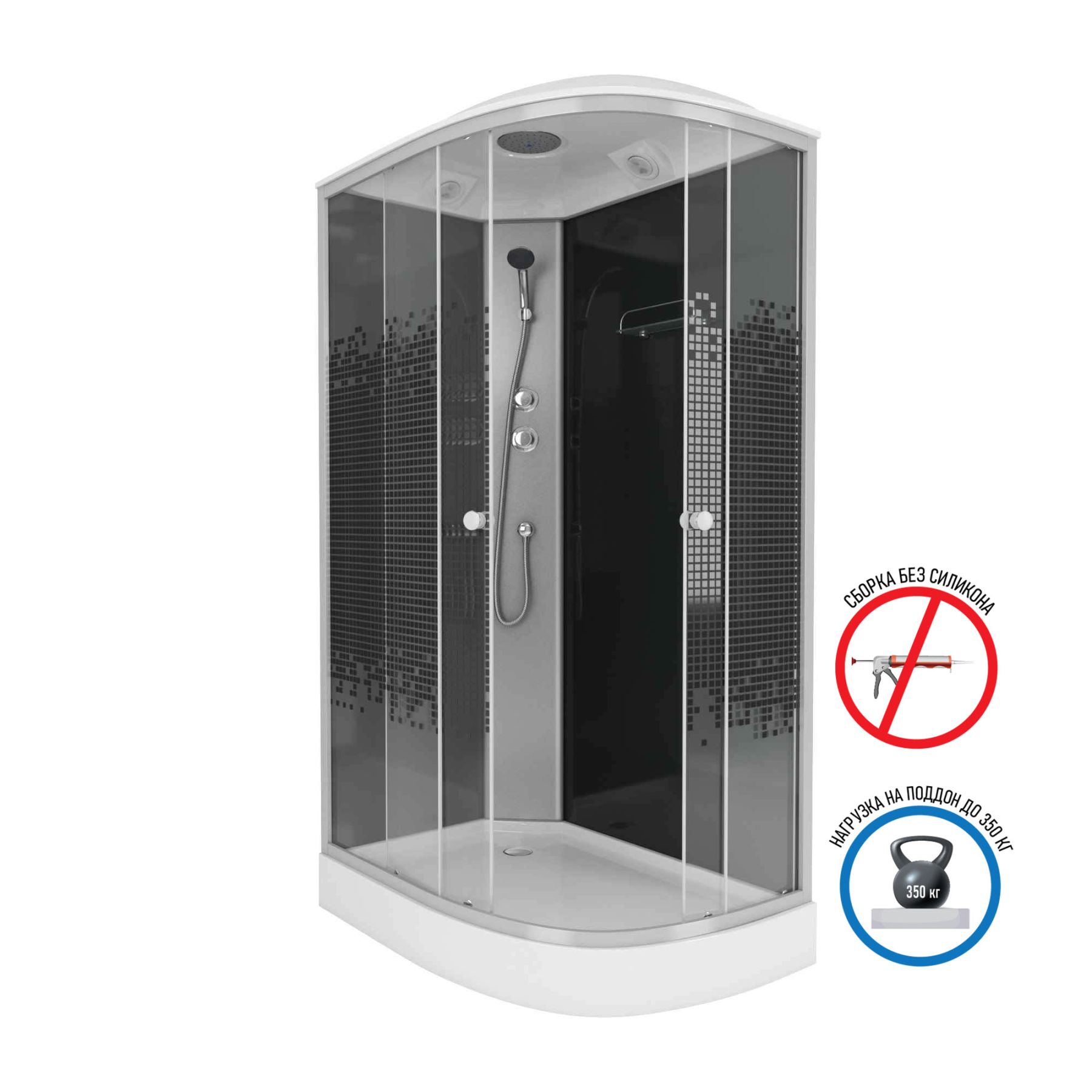 рисунок - мозаика, вентиляция, смеситель 2-х режимный, тропический душ, ручной душ, одинарные ролики